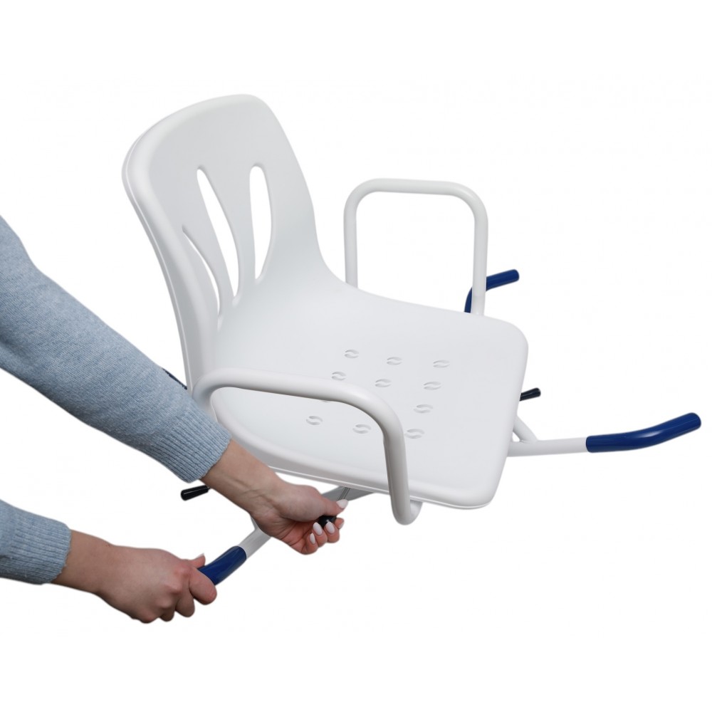Сиденье оснащено удобными подлокотниками и спинкой, которые поддерживают правильное положение тела и снижают нагрузку на спину. Отверстия на сидении обеспечивают быстрый отвод воды, предотвращая ее накопление. Дренаж способствует быстрому высыханию сиденья, что повышает гигиеничность.